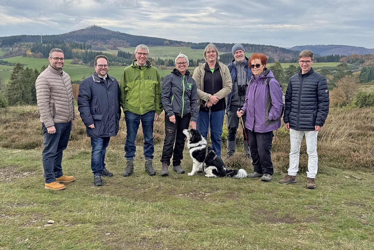 Der Erste Kreisbeigeordnete und Vorsitzende der Stiftung für Natur und Umwelt Pascal Badziong (2.v.li) besuchte gemeinsam mit Staatssekretär Dr. Erwin Manz (3.v.li) und Torsten Welling (MdL, 1.v.li) sowie weiteren kommunalen Vertretern und Projektbeteiligten die Wacholderheiden in Arft: Tanja Stromberg, Geschäftsstellenleiterin der Stiftung für Natur und Umwelt im Landkreis Mayen Koblenz, Biologe Jörg Hilgers, Volker Hartmann von der SGD Nord, Mechthild Stoll, Erste Beigeordnete der OG Langscheid und Daniel Müller, Planungsbüro Hilgers (4.–8.v.li.). Foto: Kreisverwaltung MYK/Wiebke Schaaf